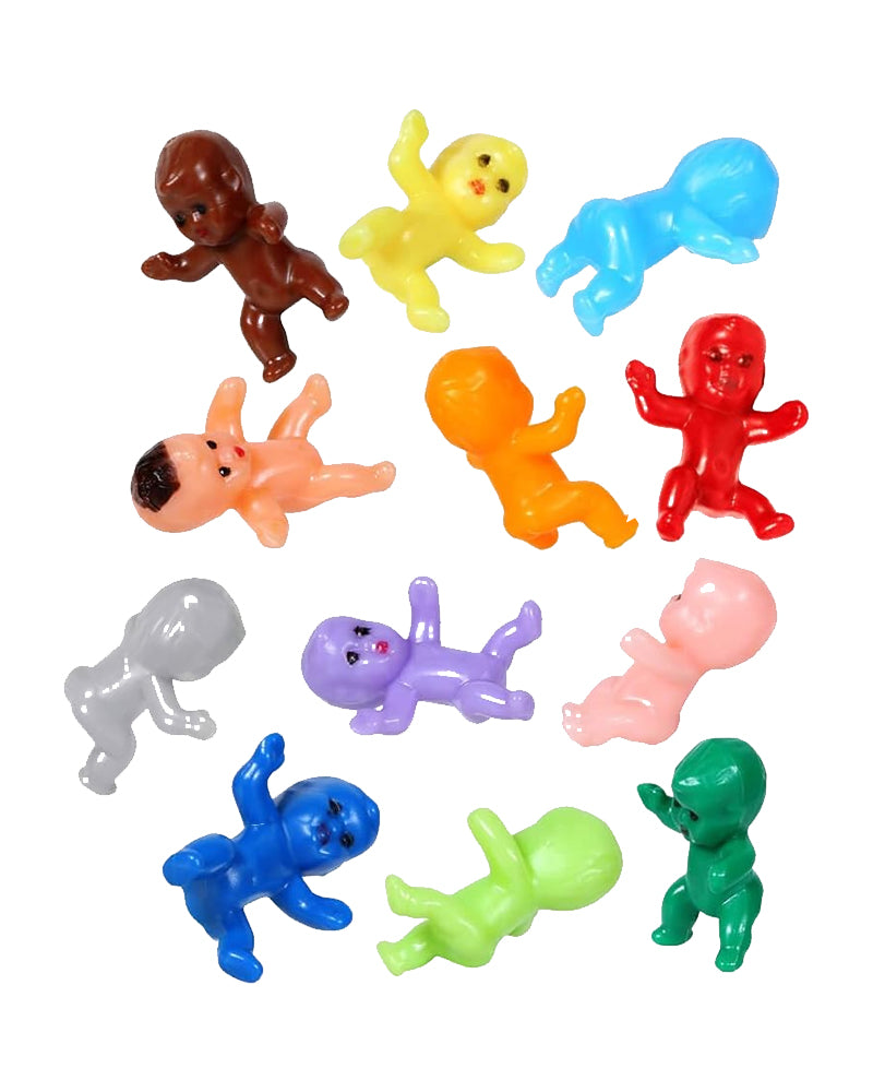 Tiny weird plastic babies in 12 colors. Some people say these are king cake babies, but we just think they are little weird guys. They are about an inch tall and a little over half an inch wide. Colors selected at random.